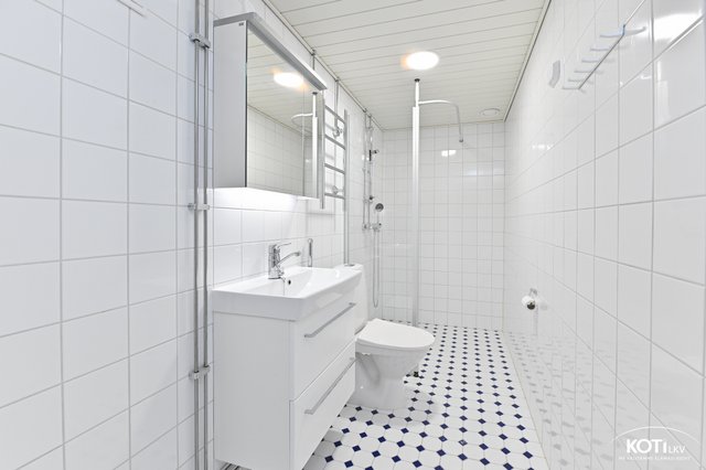 - WC-istuin, suihku, bidee-suihku, suihkuseinä, pesukoneliitäntä, allaskaappi, ja peilikaappi