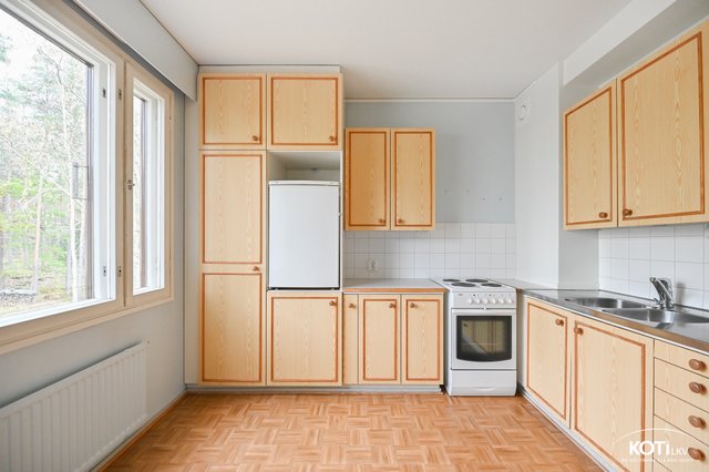 - Keittiöön mahtuu ruokapöytä ja ikkunasta näkymät metsään.