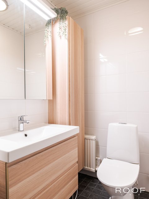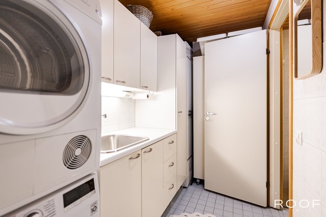 - Lattialämmitys, pesuallas, pyykkikaapit, pöytätaso, tila pesutornille, ja lämminvesivaraaja