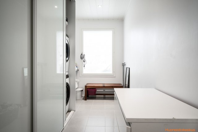 - Pesukoneliitäntä (Pesutornille paikka), lattialämmitys, lattiakaivo, pöytätaso, ja tila pesutornille
