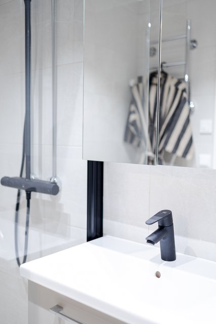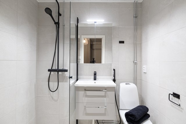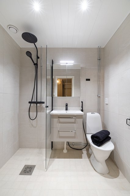 - WC-istuin, suihku (Oraksen musta sadevesisuihku), suihkuseinä, pesukoneliitäntä, lattialämmitys, peilikaappi, bidee-suihku (Oras musta), ja allaskaappi (laatikoilla)