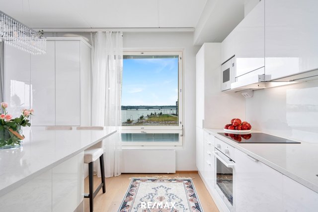 - Kaunis vaaleasävyinen avokeittiö on varustettu liesitasolla, kalusteuunilla, liesituulettimella, integroidulla mikroaaltouunilla ja astianpesukoneella. Keittiössä on iso saareke, jonka yhteydessä on runsaasti säilytystilaa. Työtasot ovat upeaa Calacattan kvartsikomposiittia, välitila lasia, seinät maalatut ja lattia parkettia.