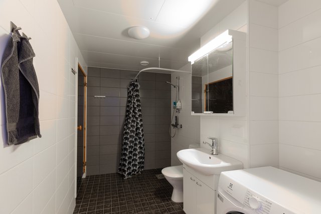 - WC-istuin, suihku, pesukoneliitäntä, lattialämmitys, peilikaappi, allaskaappi, pesuallas, ja bidee-suihku