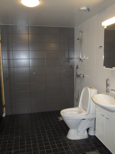 - WC-istuin, suihku, pesukoneliitäntä, allaskaappi, ja peilikaappi