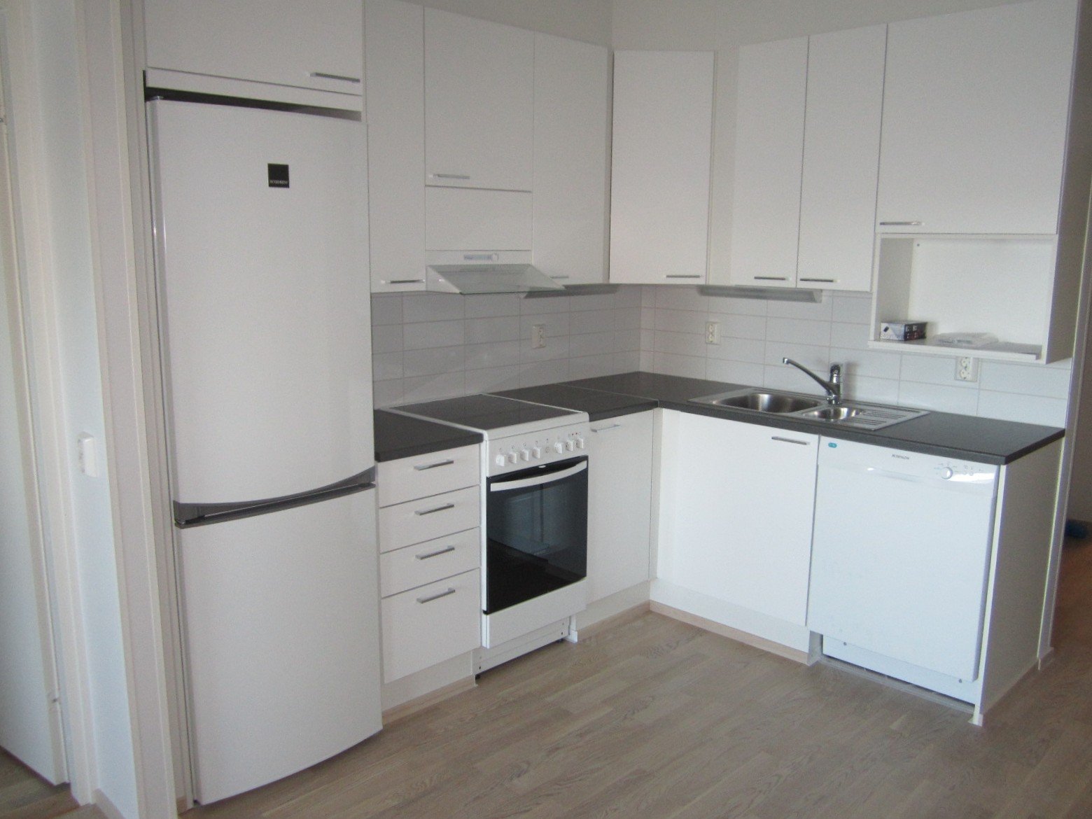 - Jääkaappipakastin, liesituuletin, astianpesukone, liesi, ja uuni