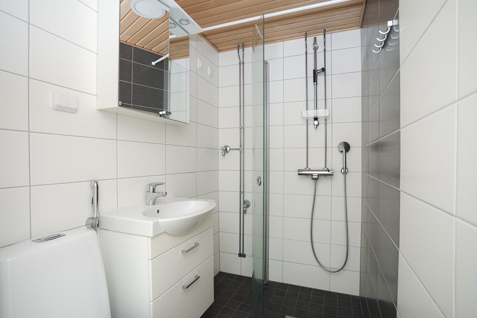 - WC-istuin, suihkukaappi, pesukoneliitäntä, lattialämmitys, peilikaappi, suihku, ja kiinteät valaisimet