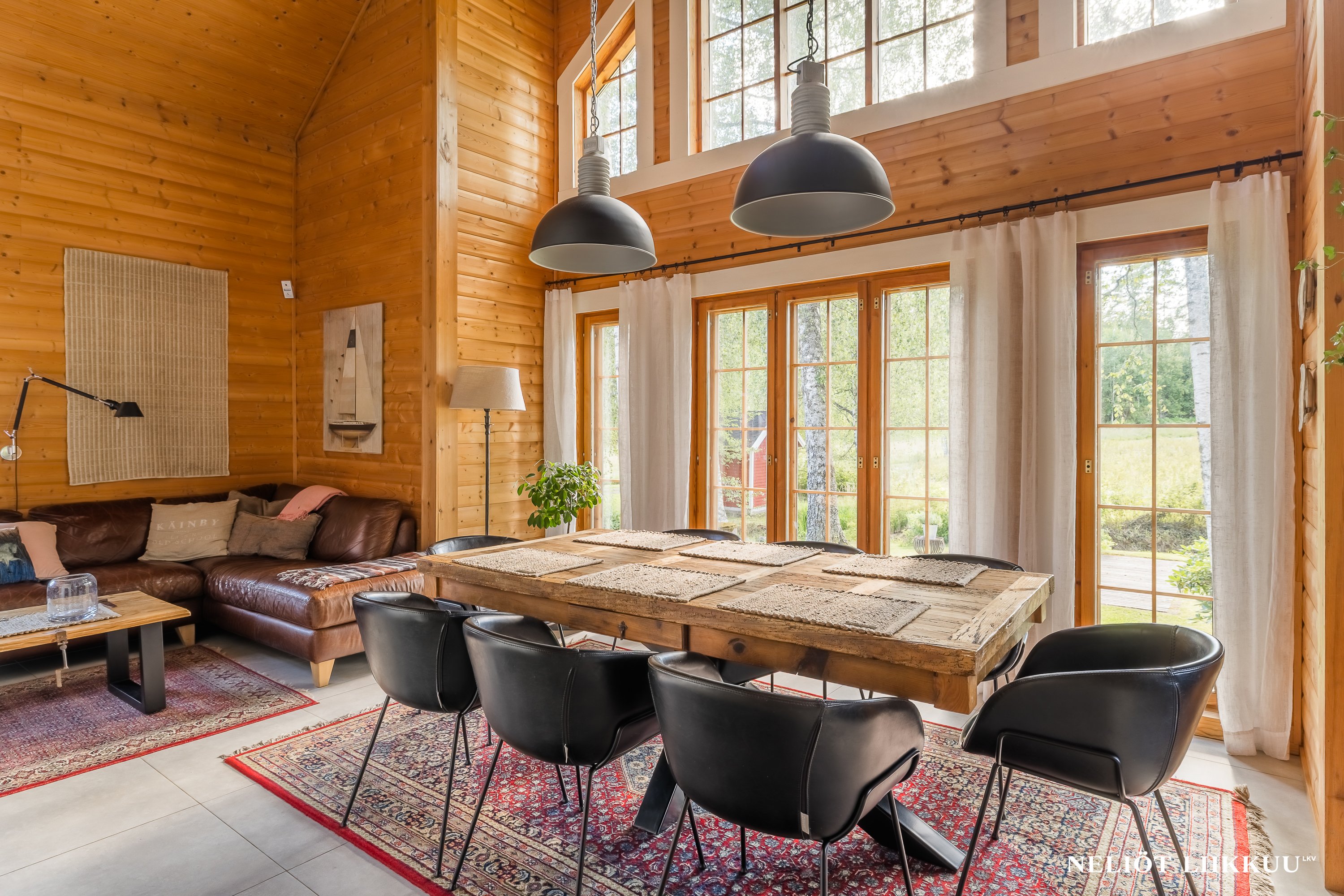 Korkea olohuone tuo tilan tuntua ja luonnonvaloa suurten ikkunoiden kautta. Lämmönlähteenä toimii jykevä takka, joka luo tunnelmaa viileinä iltoina. Keittiö on varusteltu moderneilla laitteilla, ja puuliesi tuo perinteistä tunnelmaa. Siinä on mukava keitellä vaikka pannukahvit aamupalalle.