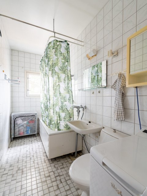 - Suihku, wc-istuin, pesuallas, pesukoneliitäntä, kylpyamme, ja peili