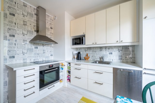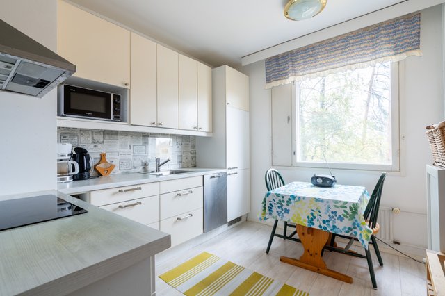Keittiö on nykyaikainen ja käytännöllinen, ja se on varustettu induktioliedellä, kiertoilmauunilla ja astianpesukoneella, jotka tekevät arjesta sujuvaa. Kylpyhuoneessa on suihku ja amme samassa, lisäksi liitäntä pyykkikoneelle. Lattioissa laminaatti, seinissä vaaleat sävyt ja hissitalon mukavuus viimeistelee asumisen helppouden.