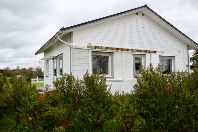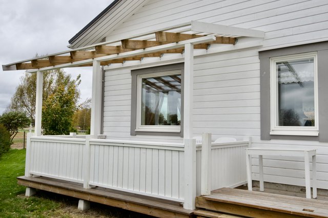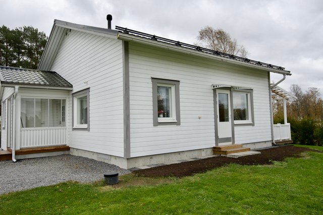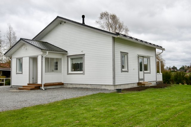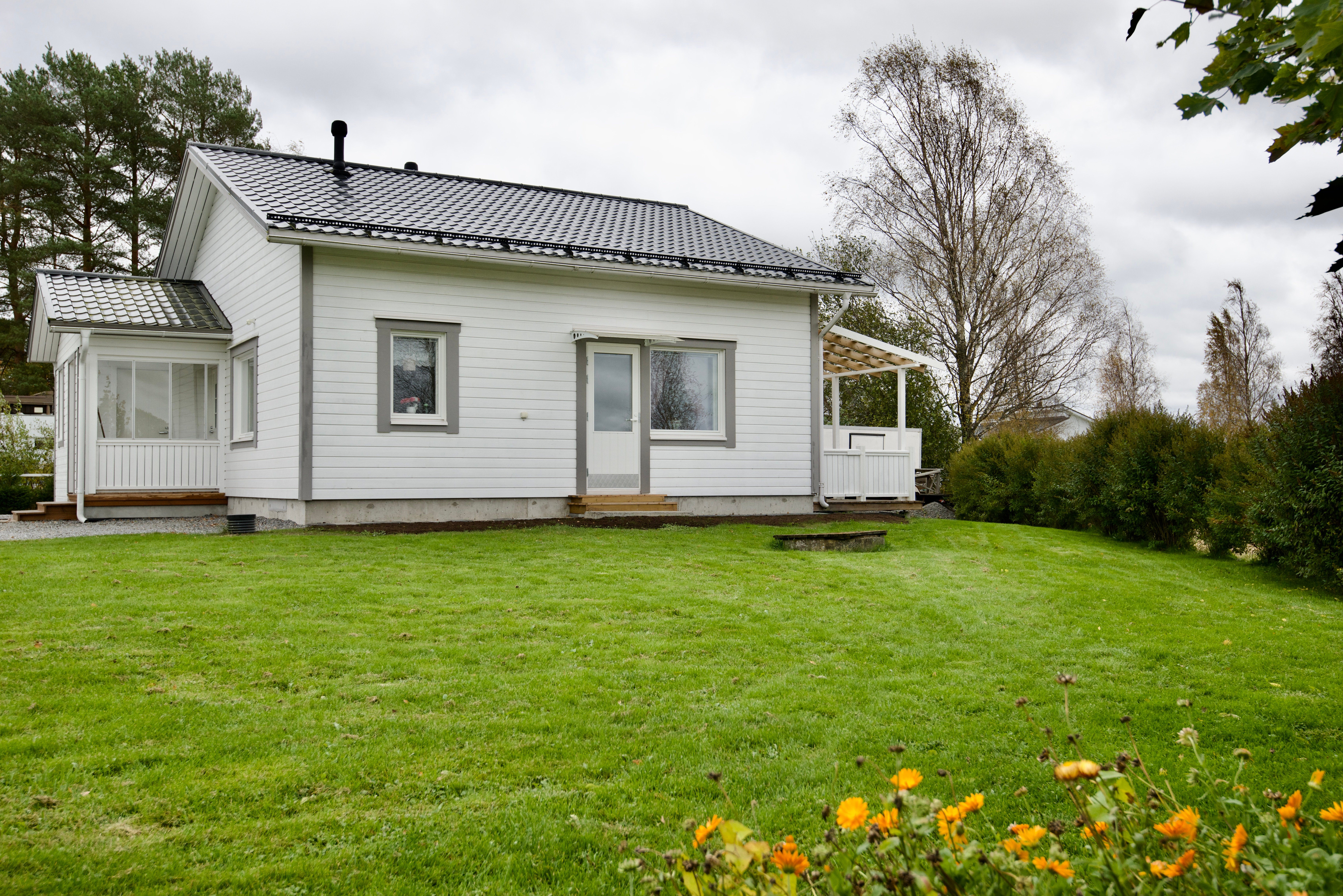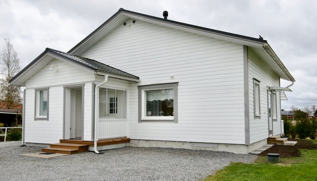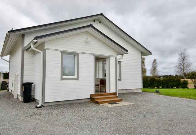 Detta trähus färdigställt 2016 erbjuder modern boendekomfort i ett plan. Huset har två sovrum, ett rymligt vardagsrum/kök och ett badrum med golvvärme.