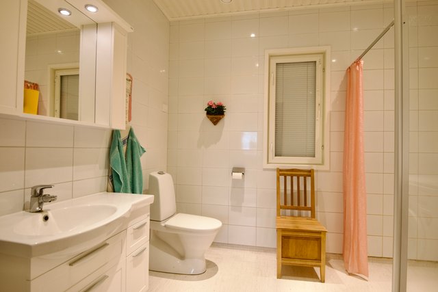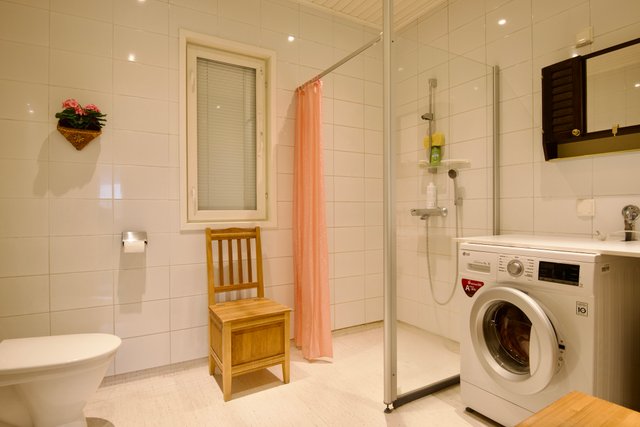 - WC-istuin, pesukoneliitäntä, suihkuseinä, lattialämmitys, peili, pesuallas, ja allaskaappi