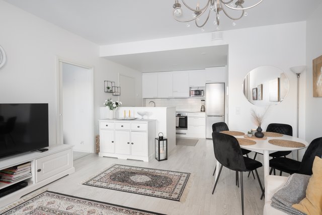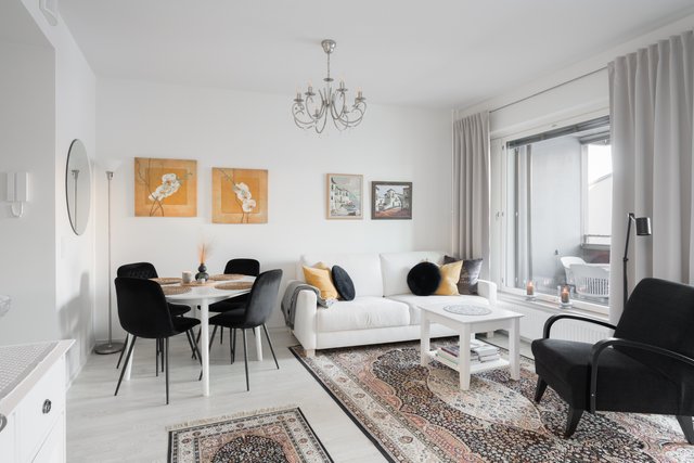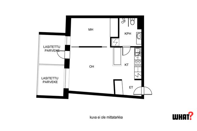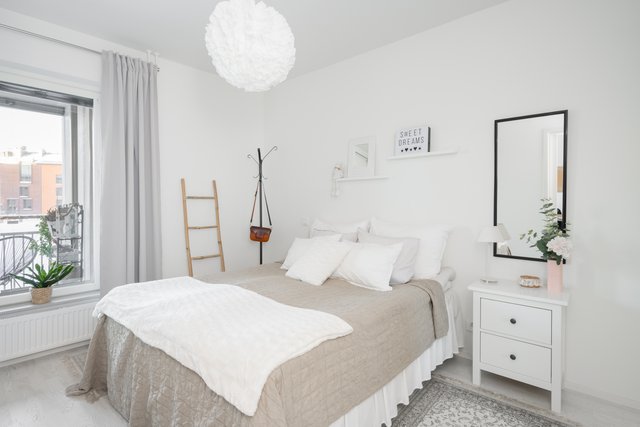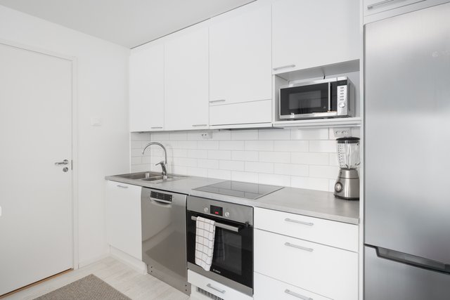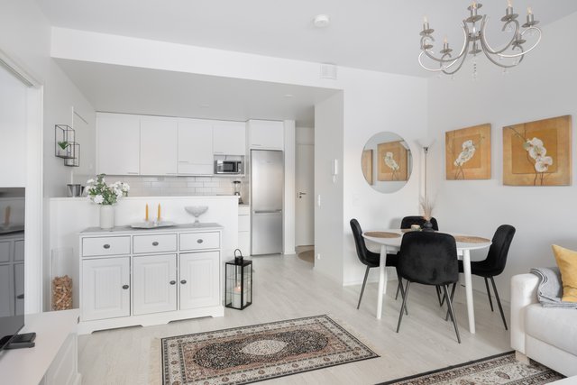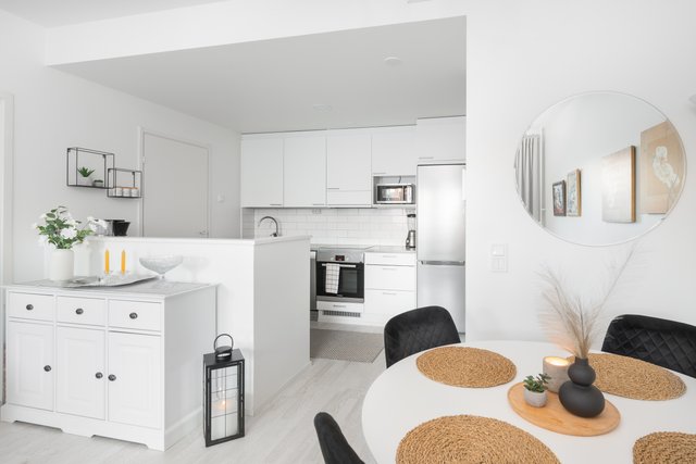 Asunnon vaaleat pinnat luovat raikkaan ja ajattoman ilmeen. Keittiössä on hyvin tilaa ruoanlaittoon. Kylpyhuone on poikkeuksellisen tilava, ja siellä on helppo liikkua arjessa. Makuuhuone on reilun kokoinen ja erittäin toimiva: liukuovet kahdelta puolelta mahdollistavat sujuvan kulun, isompikin sänky mahtuu vaivatta ja tilaa jää silti kiertää sängyn ympäri. Liukuovikaapistot tarjoavat hyvin säilytystilaa, ja huoneeseen mahtuu lisäksi esimerkiksi työpiste.