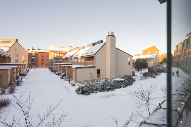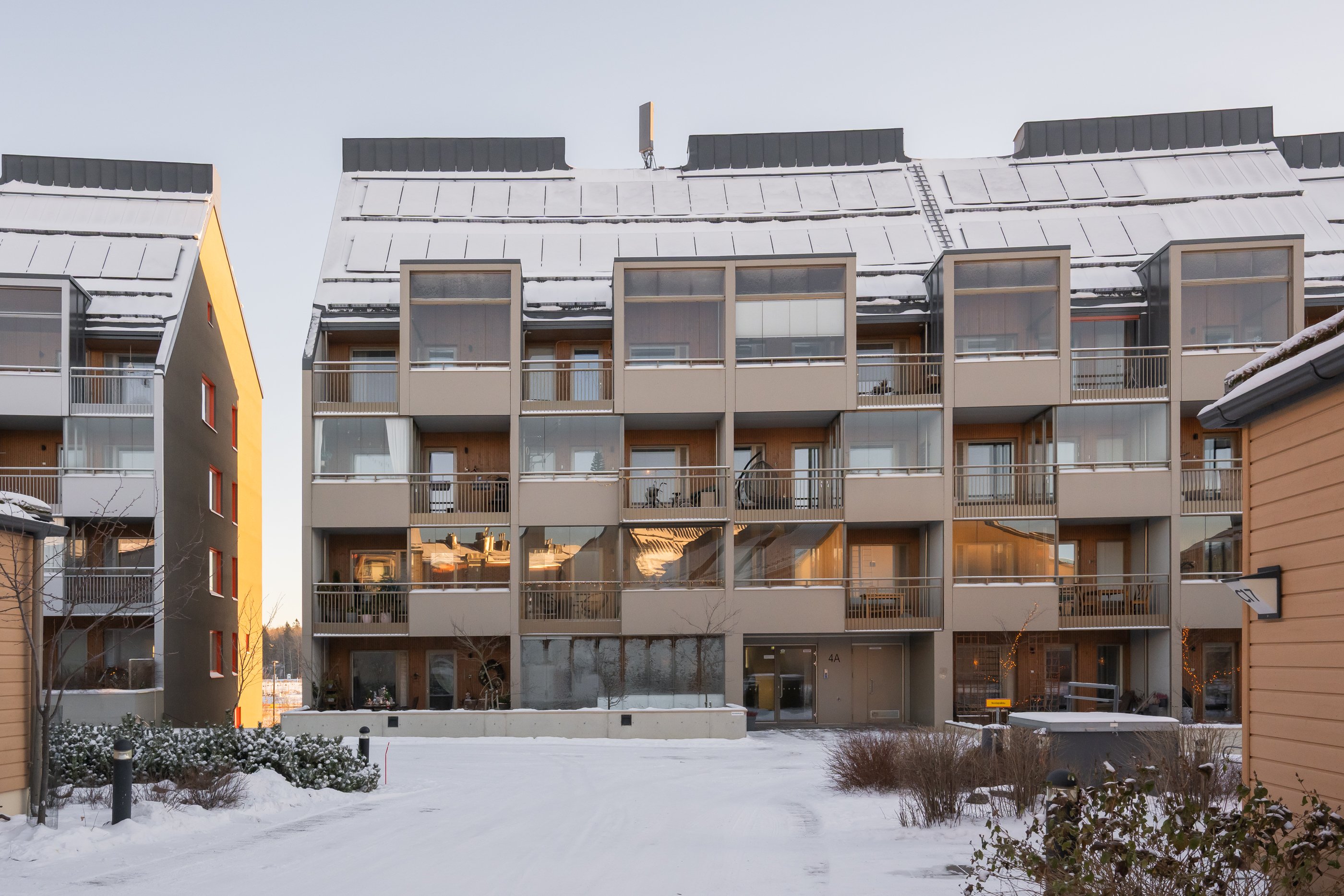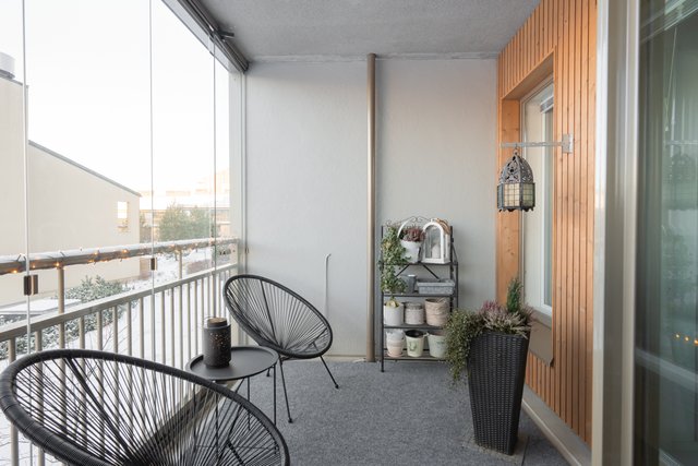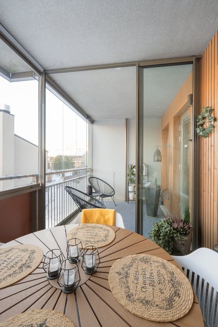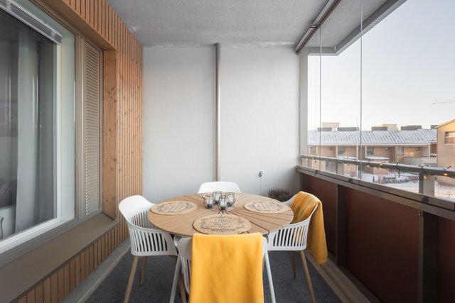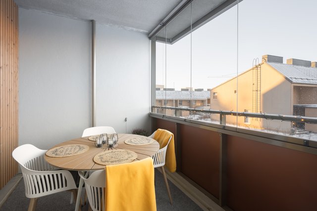 Asunnon ehdoton kruunu on noin 13 m²:n lasitettu parveke, joka on jaettu liukuovilla kahteen osaan. Toiselle puolelle mahtuu mainiosti ruokailuryhmä, ja iltaisin ympäristön valaistus luo parvekkeelle erityisen viihtyisän tunnelman. Sijainti on rauhallinen – aivan asunnon vieressä ei kulje vilkkaita teitä.