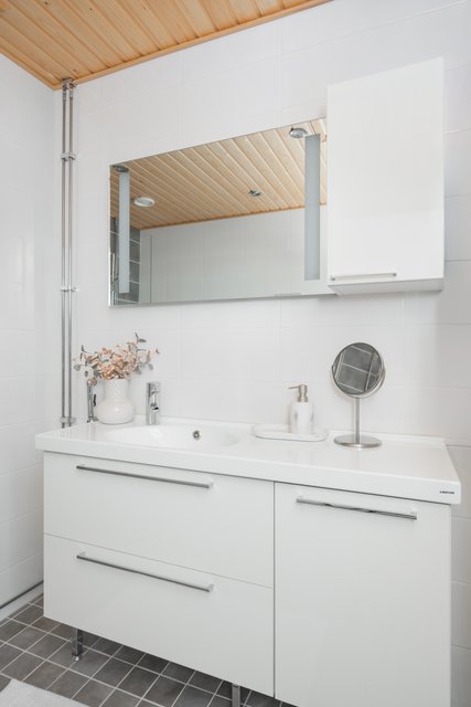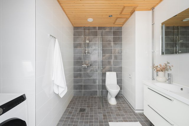 - WC-istuin, suihku, suihkuseinä, allaskaappi, peili, pesukoneliitäntä, ja lattialämmitys