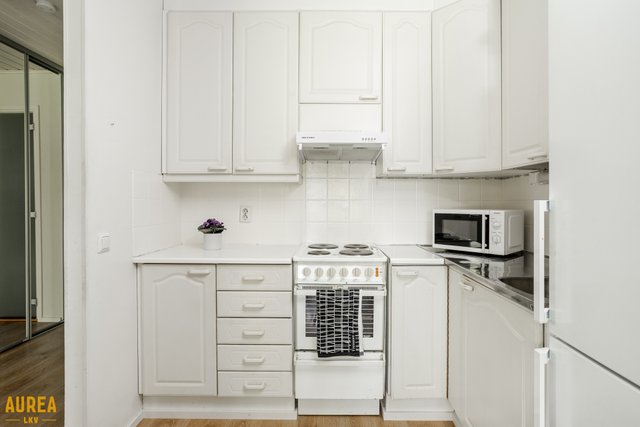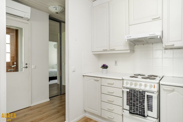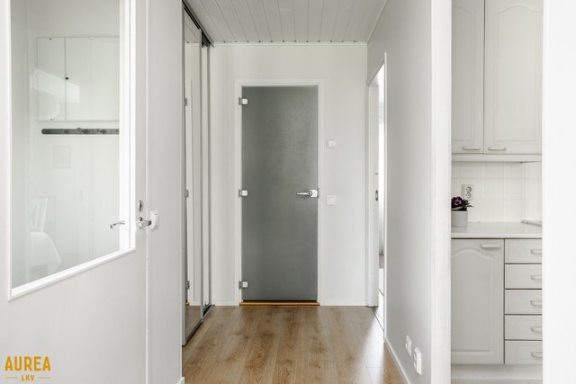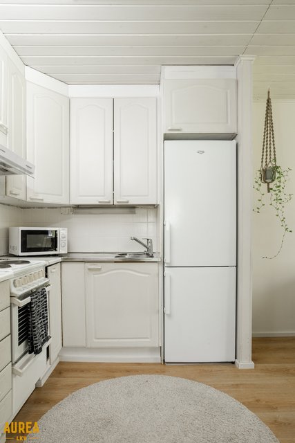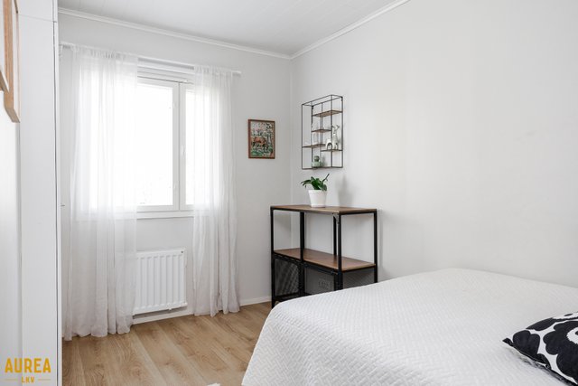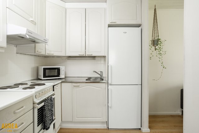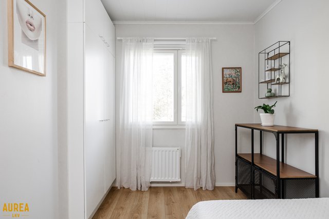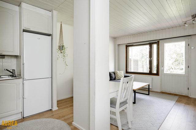 Valoisa olohuone avautuu ikkunasta puistomaisiin näkymiin ja luo rauhallisen tunnelman arjen keskelle. Keittiö on vaalea ja siisti, ja olohuoneen puolella on sopivasti tilaa ruokailuryhmälle. Makuuhuoneessa on käytännölliset kiintokaapistot, jotka tuovat runsaasti säilytystilaa.