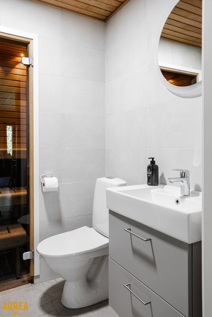 - WC-istuin, suihku, pesukoneliitäntä, allaskaappi, lattialämmitys, pesuallas, peili, ja bidee-suihku