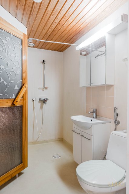 - WC-istuin, suihku, pesukoneliitäntä, lattialämmitys, pesuallas, allaskaappi, ja peili