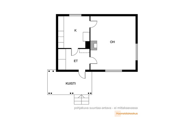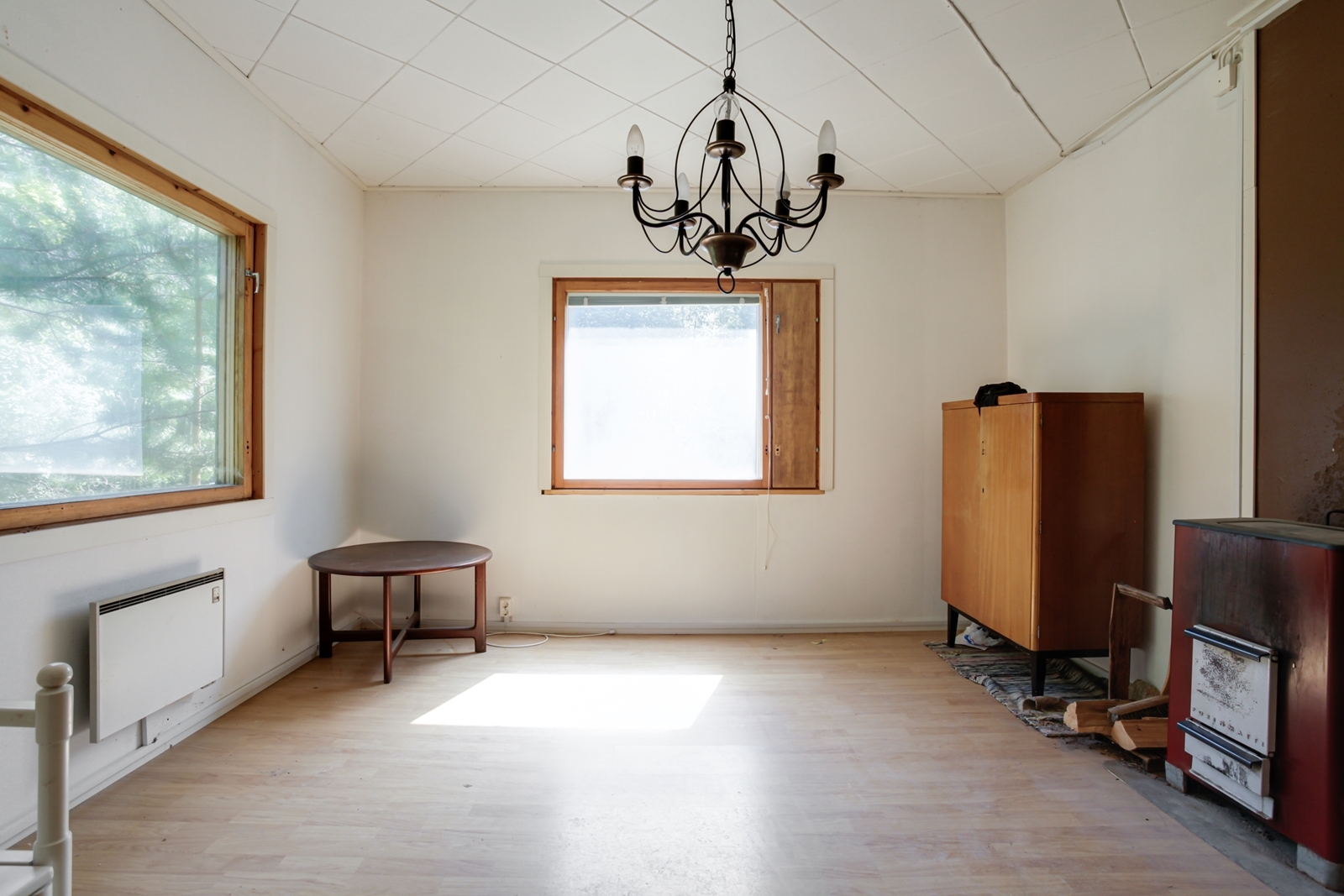 Mökissä on tilava kunnostettu olohuone, lisäksi keittiö sekä kylpyhuone.
