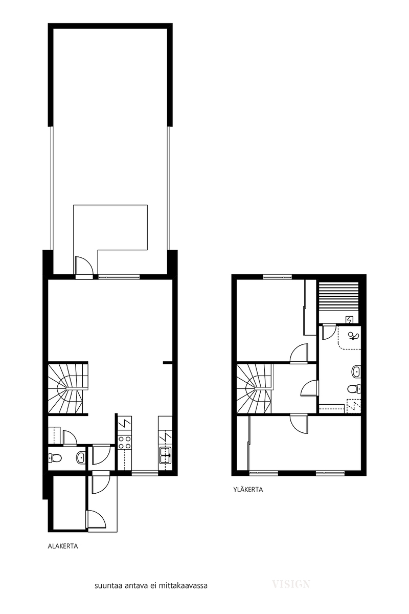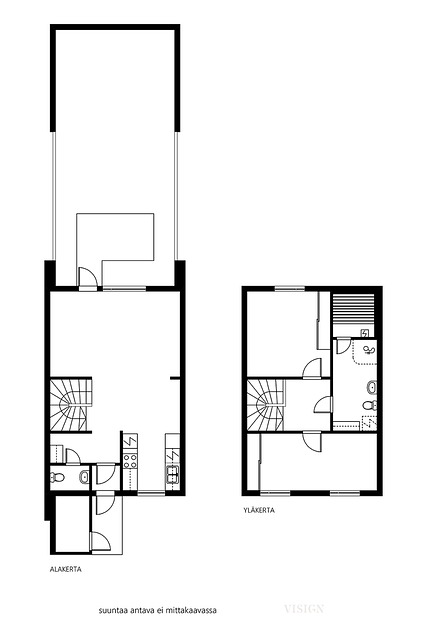 Alakerran keittiö ja olohuone ovat avonaista yhtenäistä tilaa. Yläkerrassa on kaksi makuuhuonetta sekä sauna ja kylpyhuone. Yläkerran toinen makuuhuone voidaan jakaa kahdeksi erilliseksi tilaksi.