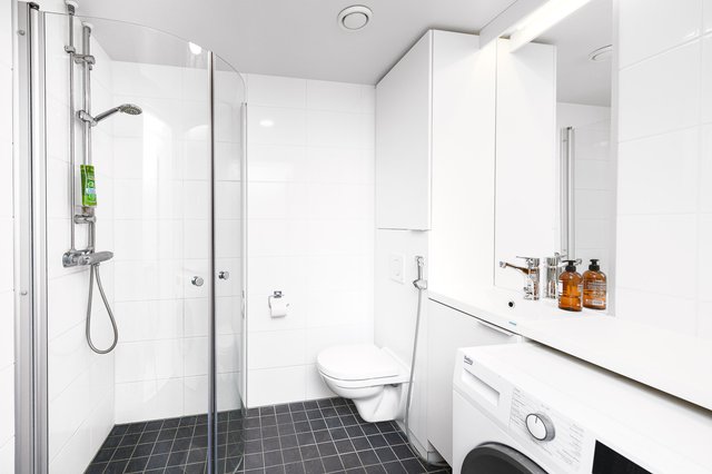 - WC-istuin, suihku, suihkuseinä, pesukoneliitäntä, pesuallas, allaskaappi, peili, bidee-suihku, ja lattialämmitys