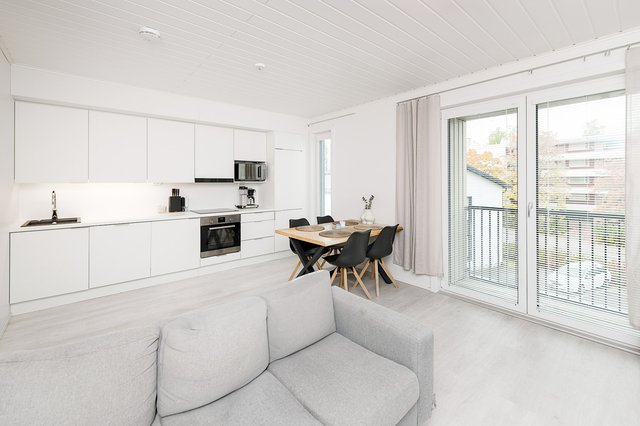 Asunnossa on avara olohuone ja keittiö, jossa on kaikki tarpeellinen ruoanlaittoon, kuten induktioliesi ja erillisuuni. Makuuhuone on mukavan kokoinen, ja kylpyhuoneessa on lattialämmitys, mikä tuo arkeen ripauksen luksusta. Länteen avautuva parveke tarjoaa rauhallisen paikan nauttia ilta-auringosta.