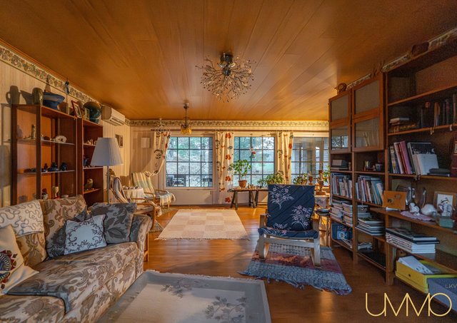 - Tilava olohuone, joka jatkuu ruokailutilasta. Aikakaudelleen tyypilliset isot ikkunat takaavat luonnon valon ympäri vuoden.