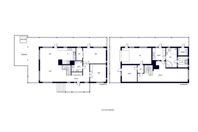 - Huoneistoala 156m2 laskettu pohjapiirroksesta. Rakennuspiirustusten mukaan kokonaisala 245,5 m2. Muut tilat: 37m2 (tekninen tila, varasto, autotalli) Ei tarkistusmitattu. Pinta-ala voi siis olla edellä mainittua pienempi tai suurempi.