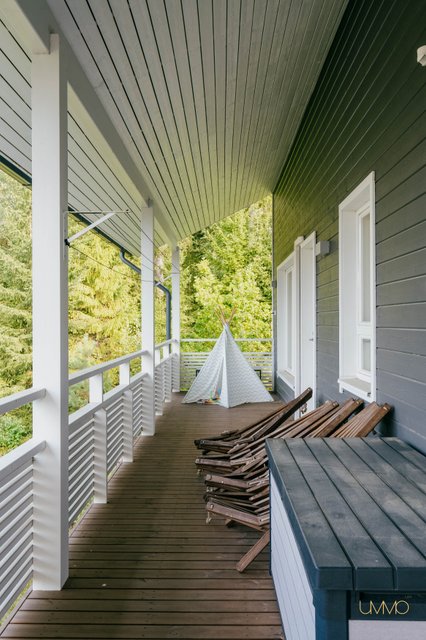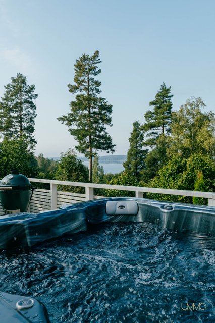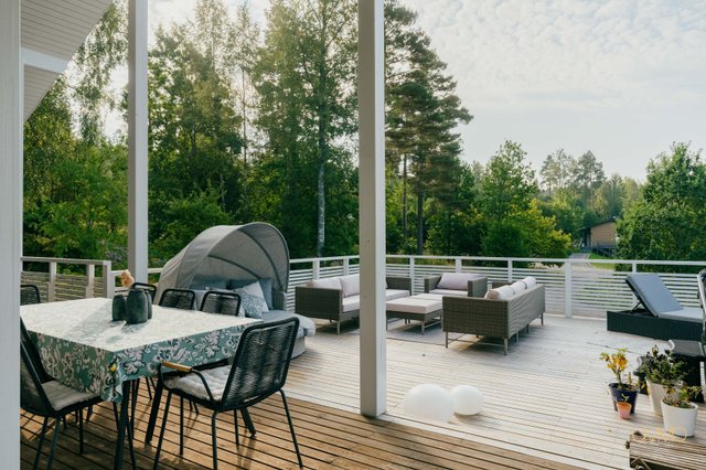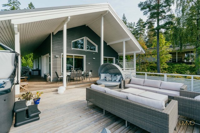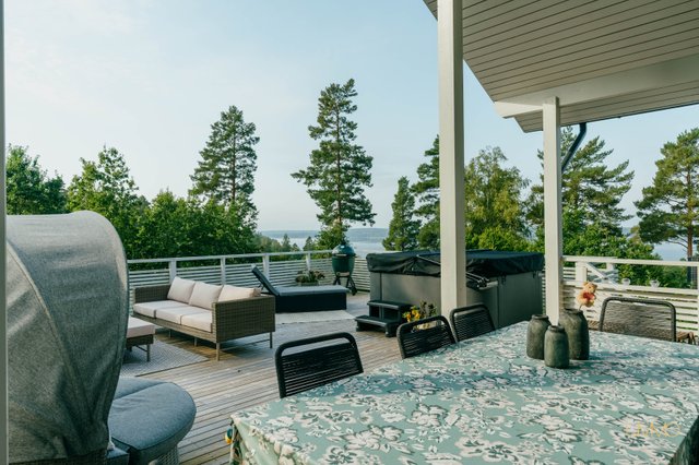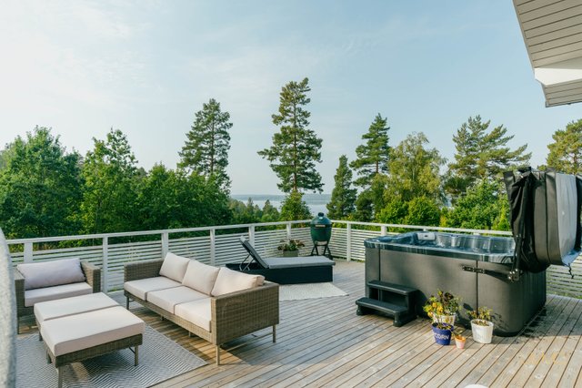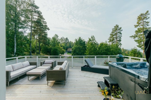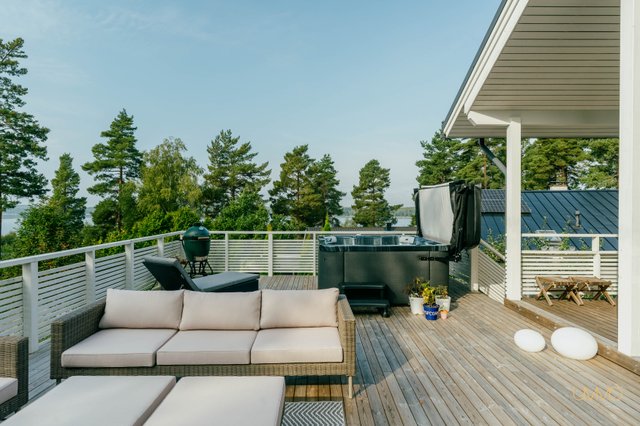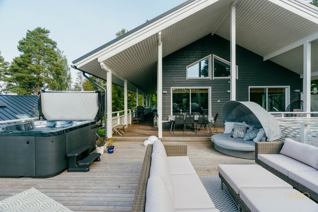 Iso parveke / terassi, jossa komeilee laadukas Novitekin poreallas. Täällä tulee varmasti vietettyä aikaa perheen ja ystävien kera.