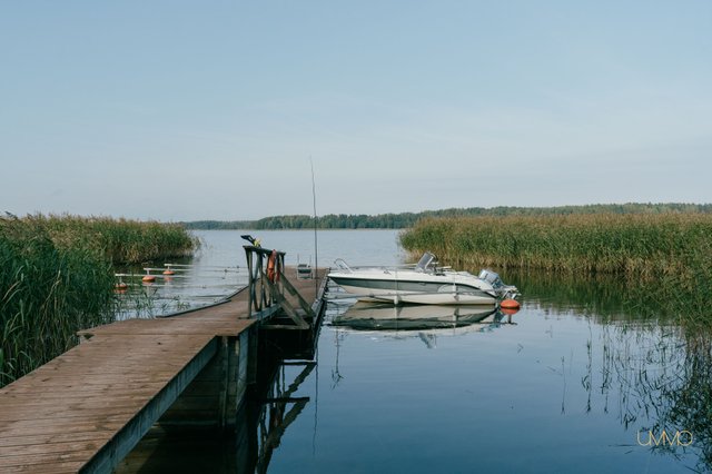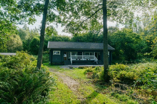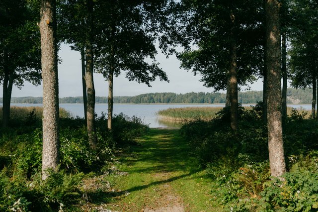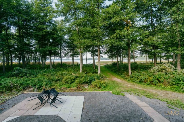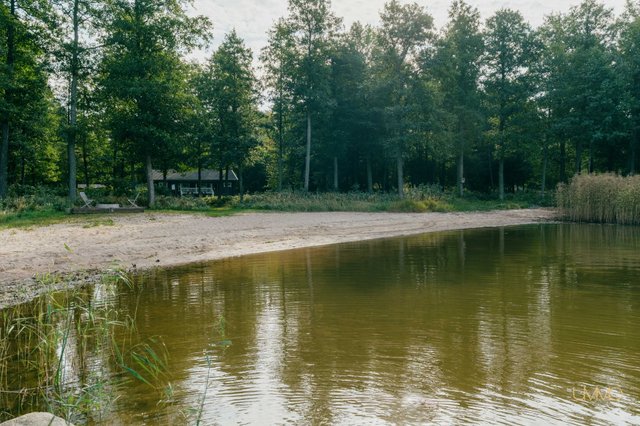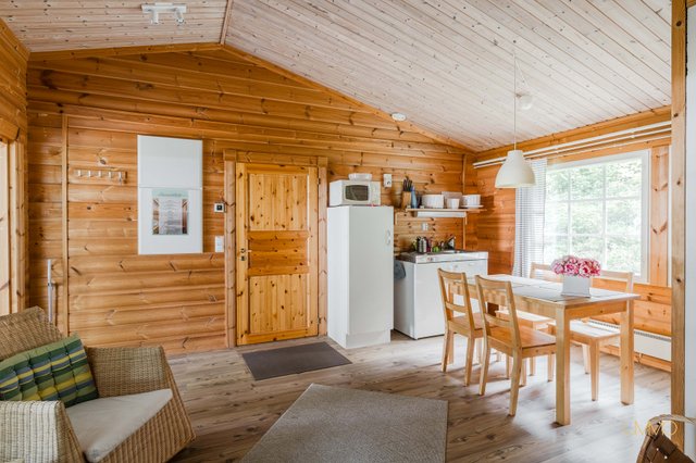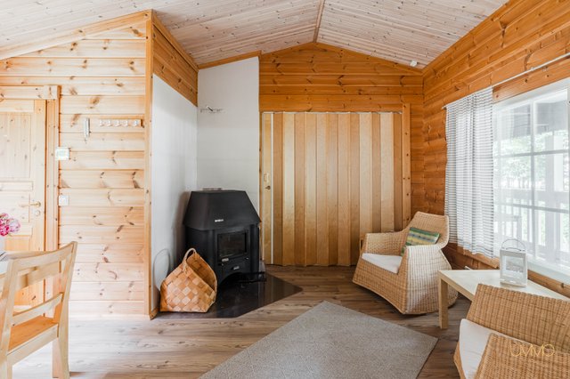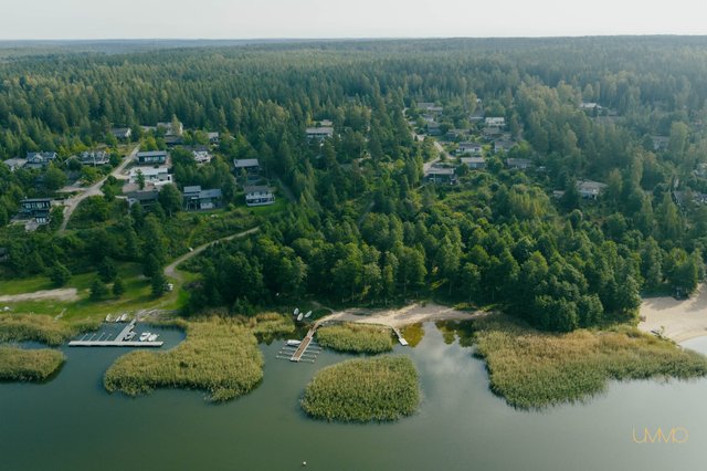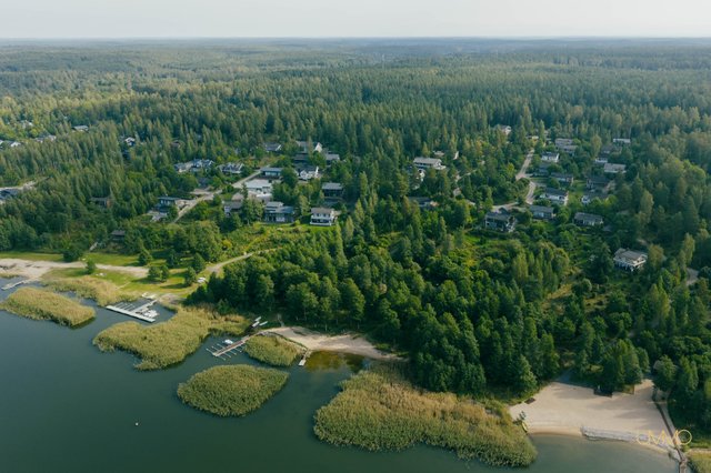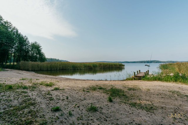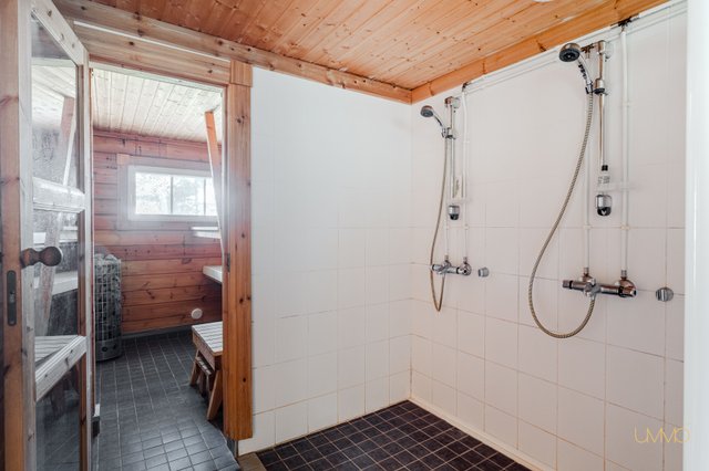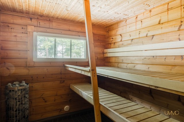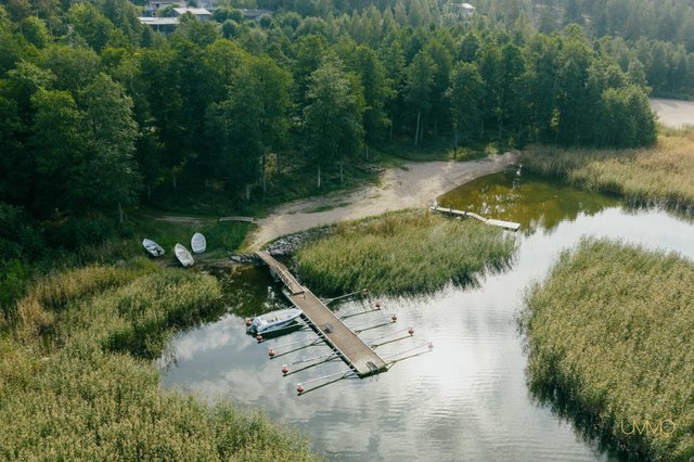 - Osuus ranta-alueeseen, jossa saunarakennuksen lisäksi venelaituri ja hiekkapohjainen uimaranta. Saunarakennuksessa olohuone, pieni keittiötila, takka, suihkutilat ja terassi.