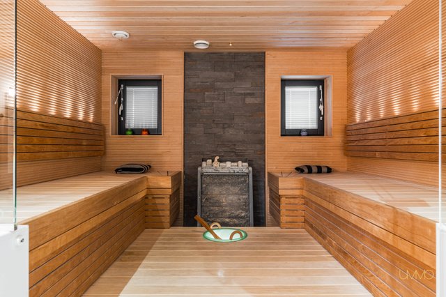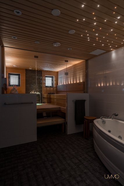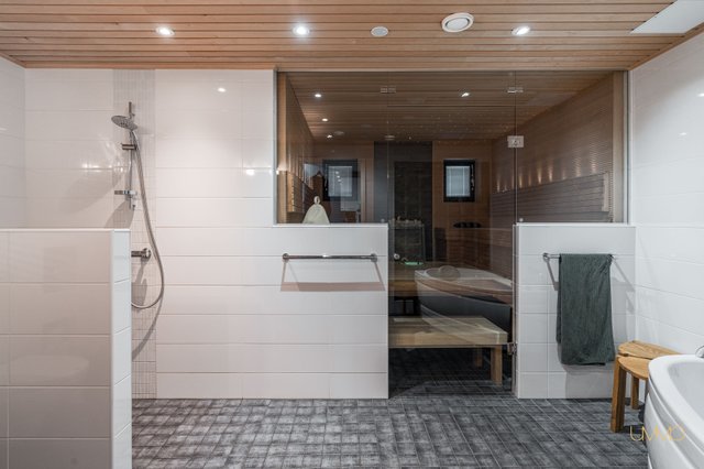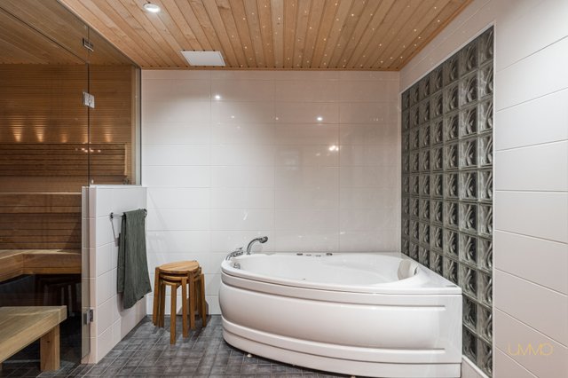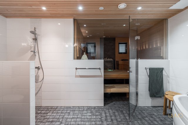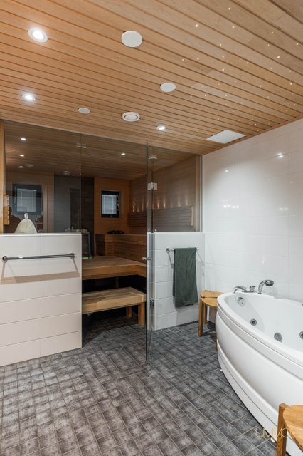 Alakerrassa takkahuone / askarteluhuone, joka toimii myös kodin kolmantena makuuhuoneena. Kylpylätasoinen saunaosasto, poreammeella. Kylpyhuoneesta löytyy myös kodin toinen wc. Tilava kodinhoitohuone, josta kulku myös ulos.