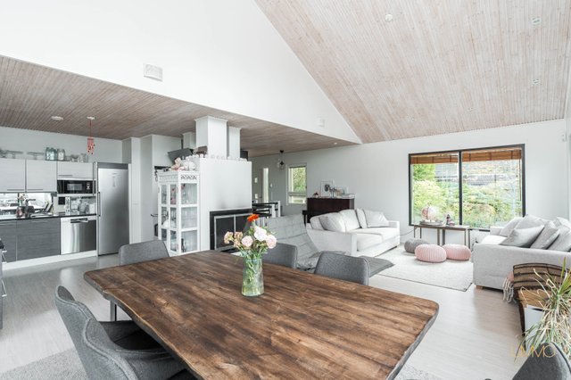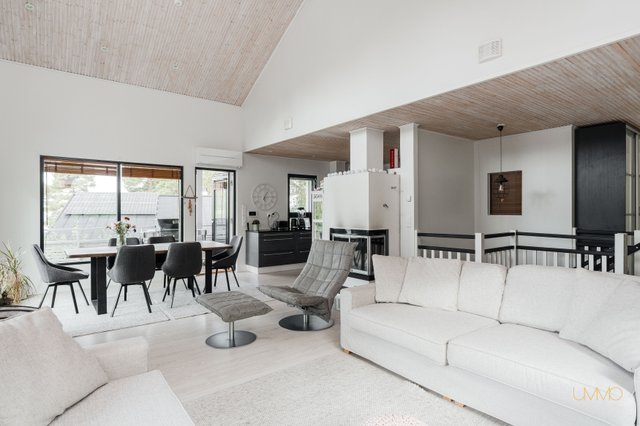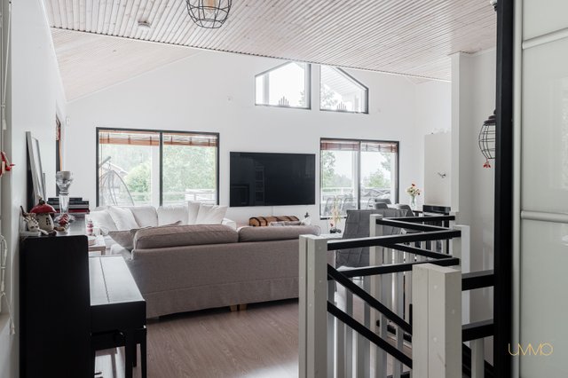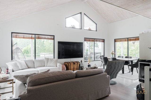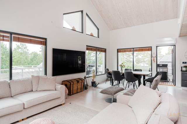 - Korkea viistokatto. Valoisa olohuone, josta näkymät merelle. Olohuoneesta käynti terassille/parvekkeelle.