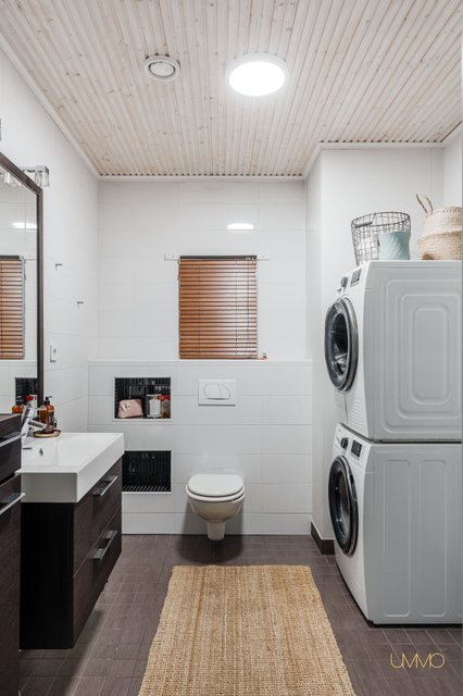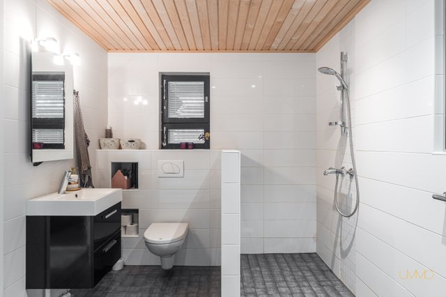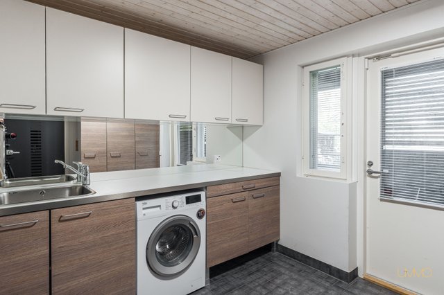- Lattialämmitys, pesukoneliitäntä, pesuallas, lattiakaivo, ja pöytätaso