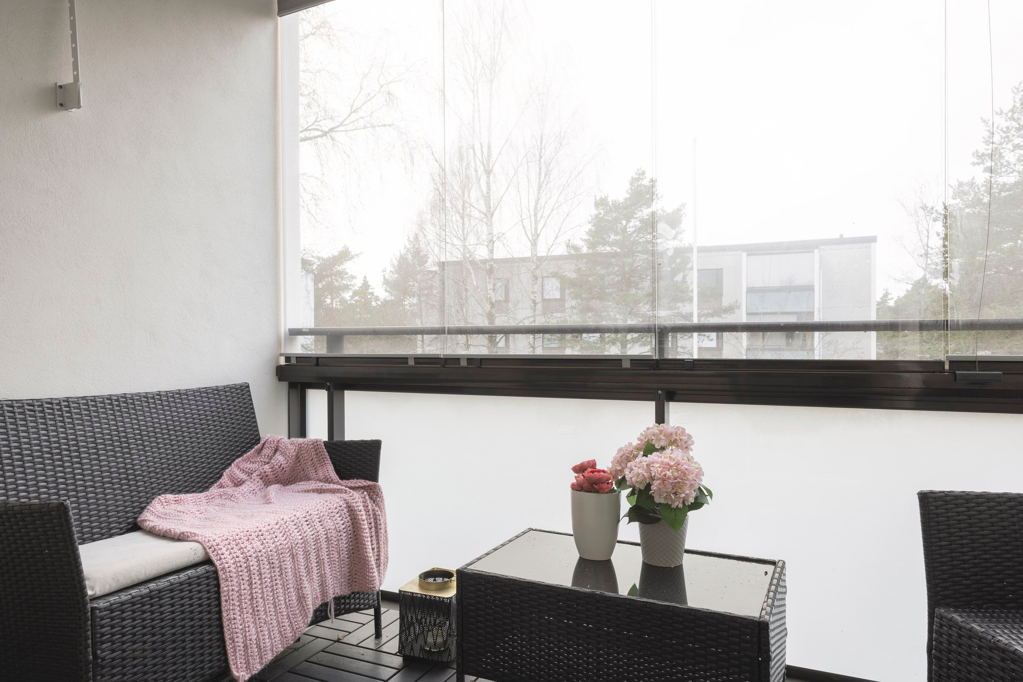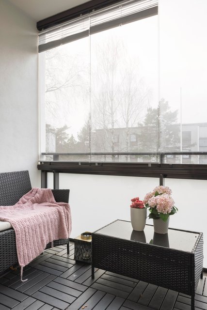 - Todella kiva ja tilava lasitettu parveke! Parvekkeen lattialla tummanharmaat terassilaatat, jotka ovat miellyttävät ja lämpimät jalalle. Lisäksi parvekkeen laseissa on säleverhot, joita voi säätää.