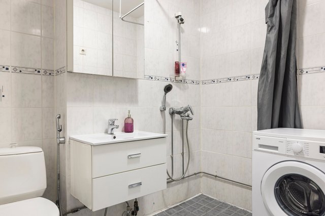 - Suihku, allaslaatikosto, pesukoneliitäntä, wc-istuin. Lattia harmaata laattaa, seinät valkoista kaakelia.