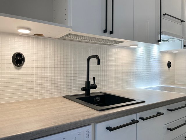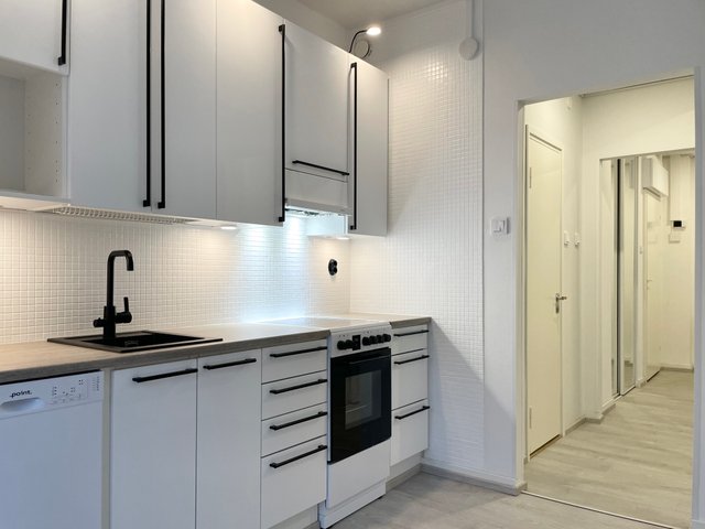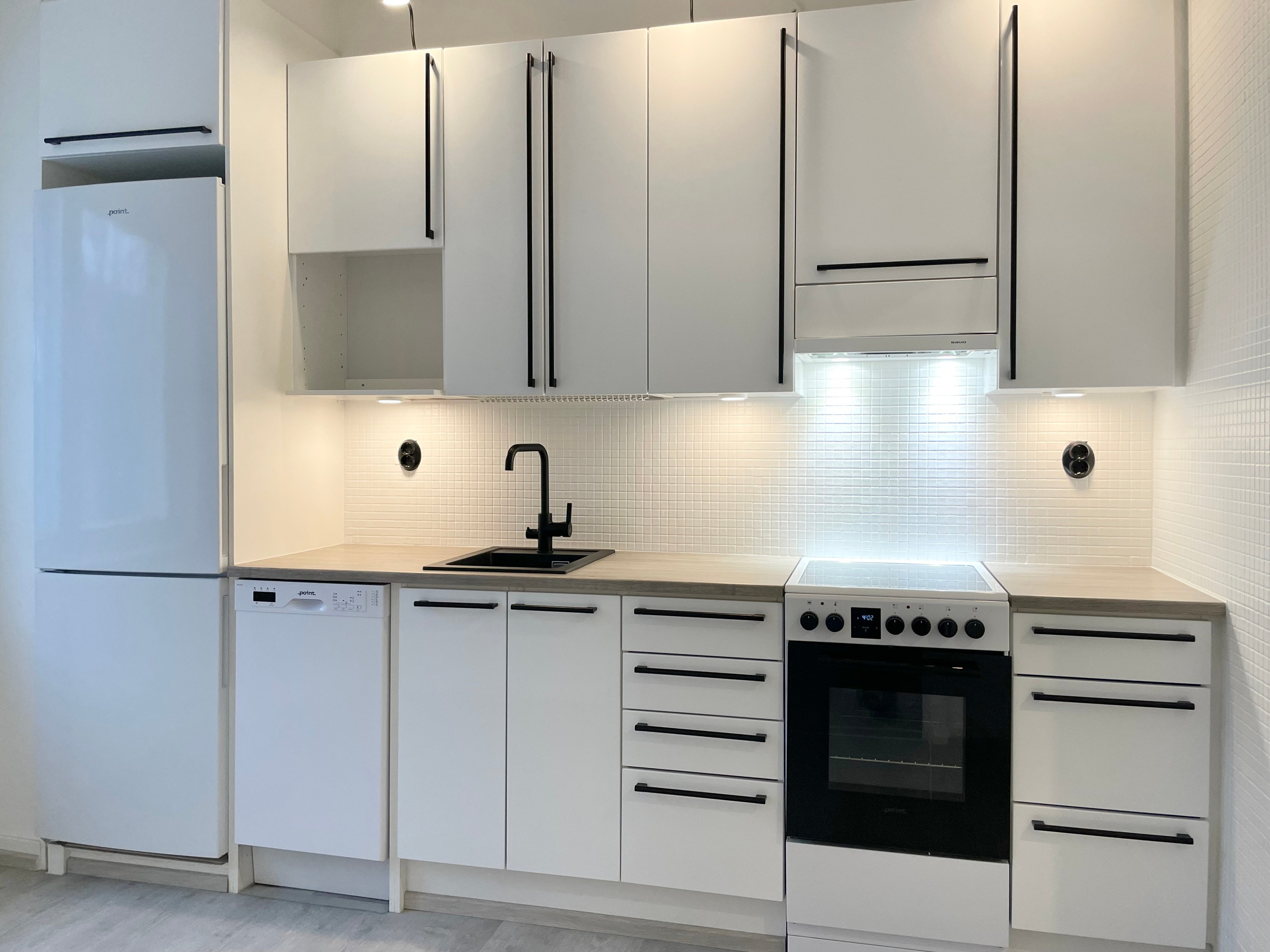 - Keittiö remontoitu 2006 ja päivitetty tasojen, altaan ja vetimien osalta 2023. Lattia vinyylilankku, seinät lasikuitutapettia. Keittiön kaapistot valkoiset, työtasot vaalean puun väriset, välitilassa valkoiseksi maalattua laattaa. Kaikki kodinkoneet uusittu 2023: jääkaappipakastin, astianpesukone, keraaminen liesi ja liesituuletin (aktiivihiili).