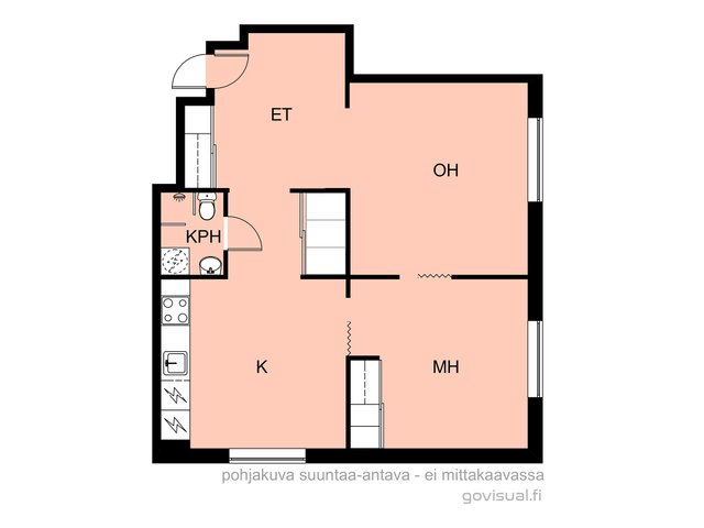 - Olohuoneen ja makuuhuoneen ikkunat noin länteen Kasarmikadun suuntaan, keittiön ikkuna noin pohjoiseen Pelastusarmeijan vanhan rakennuksen suuntaan.