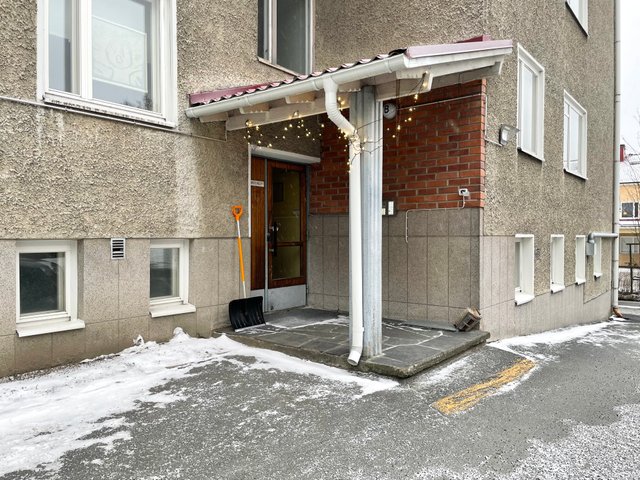Tähän ensimmäisen asuinkerroksen asuntoon noustaan muutamat raput sisäpihan puolelta. Sisäänkäynti tapahtuu eteiseen, jossa on liukuovikaapisto ja lisää kaappitilaa on keittiön menevän käytävän varrella, josta kuljetaan myös vuonna 2023 remontoituun kylpyhuoneeseen. Kylpyhuoneessa on suihku, kääntyvät suihkuseinät, pyyhepatteri, peilikaappi, allaskaappi, wc-istuin ja varaus pyykinpesukoneelle. Pyykinpesukone kuuluu halutessa kauppaan.