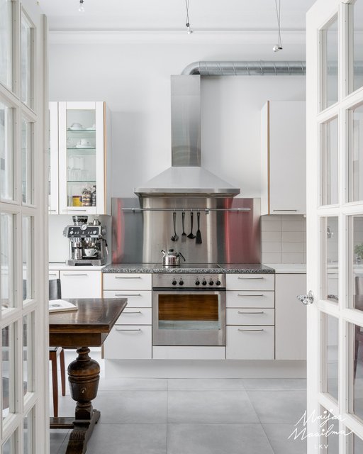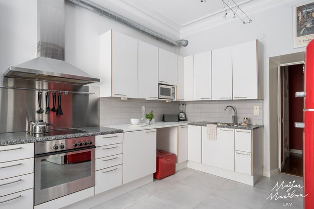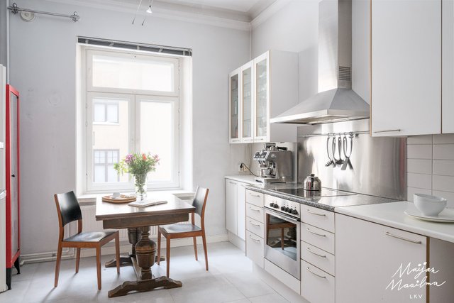 Huoneiston keittiöön on sijoitettu uuni, liesi, liesituuletin ja Smeg- jääkaappi-pakastin. Kylpyhuone/wc:ssä on kylpyamme ja tilaa pesukoneelle. Asunnon upeat yksityiskohdat kuten kattopyöristykset, kattorosetit, eteishallin kaarikatto, vanhat peiliovet, paksut kiviseinät ja hulppea huonekorkeus noin 3,3 metriä tuovat upeaa tunnelmaa.