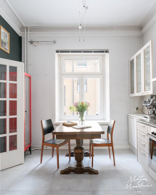 - Laattalattia, maalatut seinät. Valkoiset keittiökaapistot. Liesi, uuni, liesituuletin, Smeg- jääkaappi-pakastin. Tiskipöytätaso.