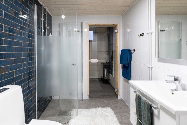 - Suihku, suihkuseinä, pesukoneliitäntä, lattialämmitys, peili, bidee-suihku, allaskaappi, ja wc-istuin