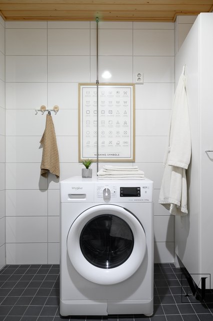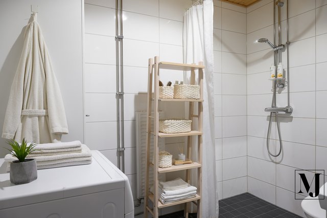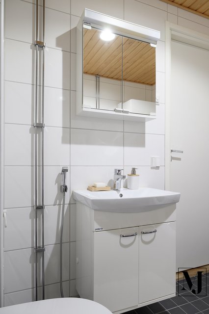- WC-istuin, suihku, suihkuseinä, pesukoneliitäntä, lattialämmitys, peilikaappi, pesuallas, ja allaskaappi