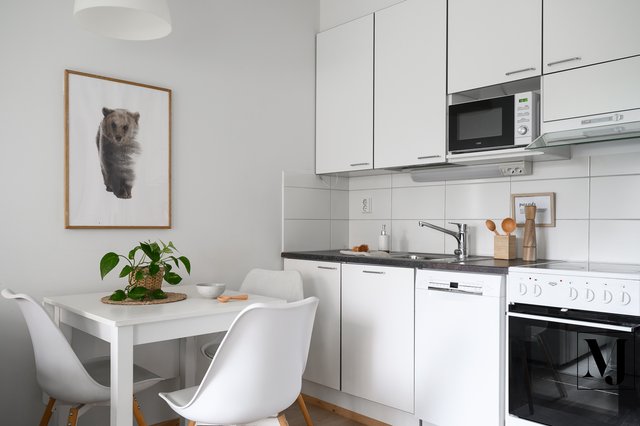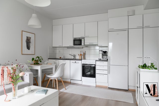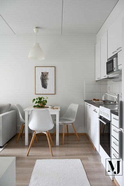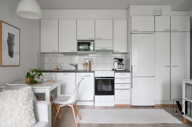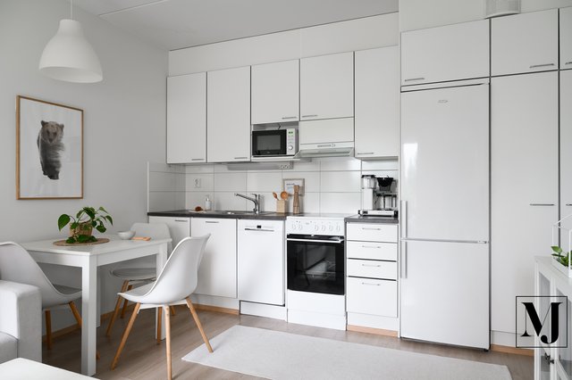 - Keittiö on raikkaan vaalea ja varusteltu jääkaappi-pakastimella, keraamisella liedellä, uunilla sekä astianpesukoneella.