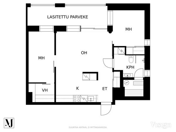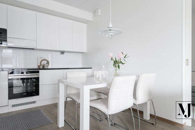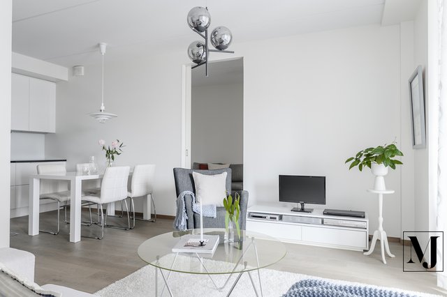- Olohuone ja keittiö ruokailutiloineen muodostavat kodikkaan ja yhtenäisen kokonaisuuden. Olohuoneesta on käynti lasiliukuoven kautta isolle, lasitetulle parvekkeelle, ja suuret ikkunat tuovat olohuoneeseen luonnonvaloa.