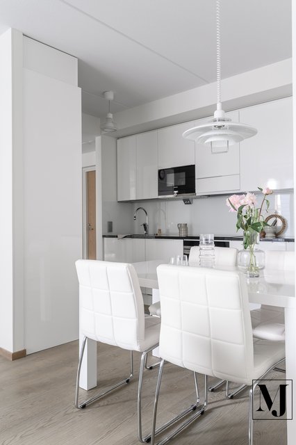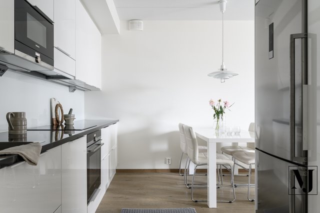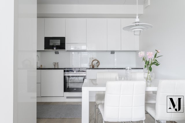 Keittiö on tyylikäs ja ajaton korkeakiiltoine Topi-keittiö, jossa on runsaasti kaappi- ja laskutilaa sekä integroidut kodinkoneet. Kivitasot viimeistelevät kokonaisuuden.