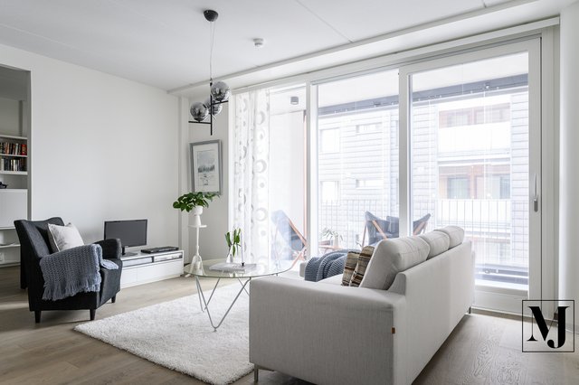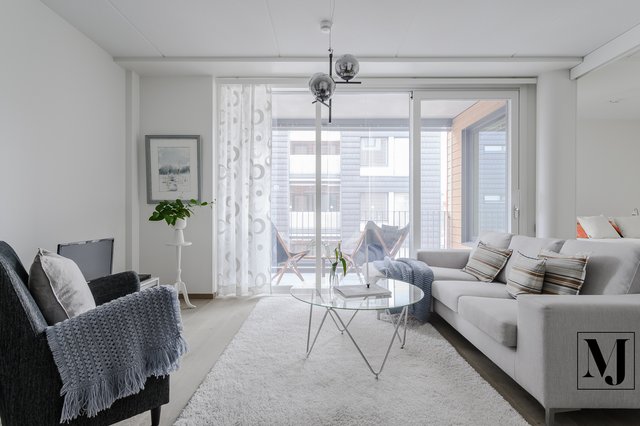 Avara pohjaratkaisu yhdistää olohuoneen ja keittiön kodikkaaksi kokonaisuudeksi. Suuret ikkunat tuovat luonnonvaloa. Olohuoneesta on käynti tilavalle lasitetulle parvekkeelle, jolta avautuvat kauniit vesistö-ja puistonäkymät.