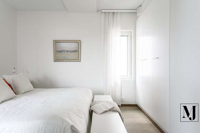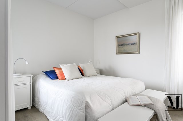 Huoneistossa on kaksi hyvänkokoista makuuhuonetta: toisessa on oma vaatehuone ja toisessa käytännöllistä kaappitilaa. Tilava kylpyhuone wc:llä ja oma sauna.