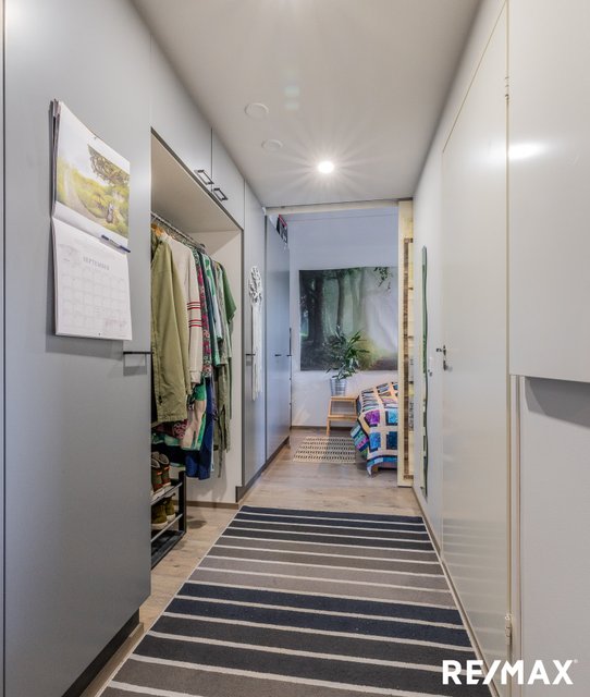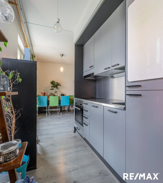 Kodin toimiva pohjaratkaisu yhdistää olohuoneen ja keittiön saumattomasti, ja makuuhuoneen liukuovet tuovat tilan tuntua. Keittiö on varustettu nykyaikaisilla laitteilla, kuten induktioliedellä ja astianpesukoneella. Kylpyhuoneessa on lattialämmitys ja pesukoneliitäntä, mikä lisää asumismukavuutta.