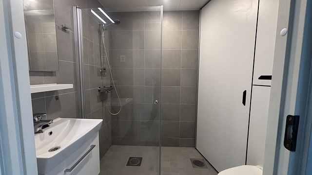 - Pesukoneliitäntä, suihkuseinä, wc-istuin, peilikaappi, ja suihku