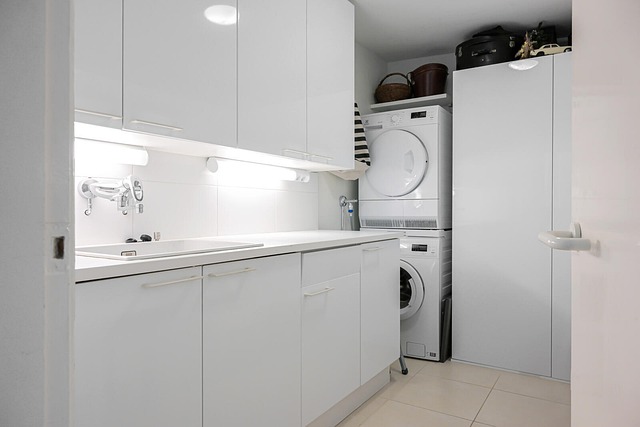 - Pesukoneliitäntä, kuivausrumpu, pyykkikaapit, pöytätaso, pesukone, ja silityspöytä/taso