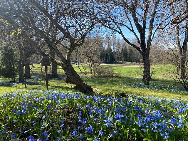 upea riippulehmus ja perennoita, sekä kauniit näkymät ilta-aurinkoon Kaskiniitylle.